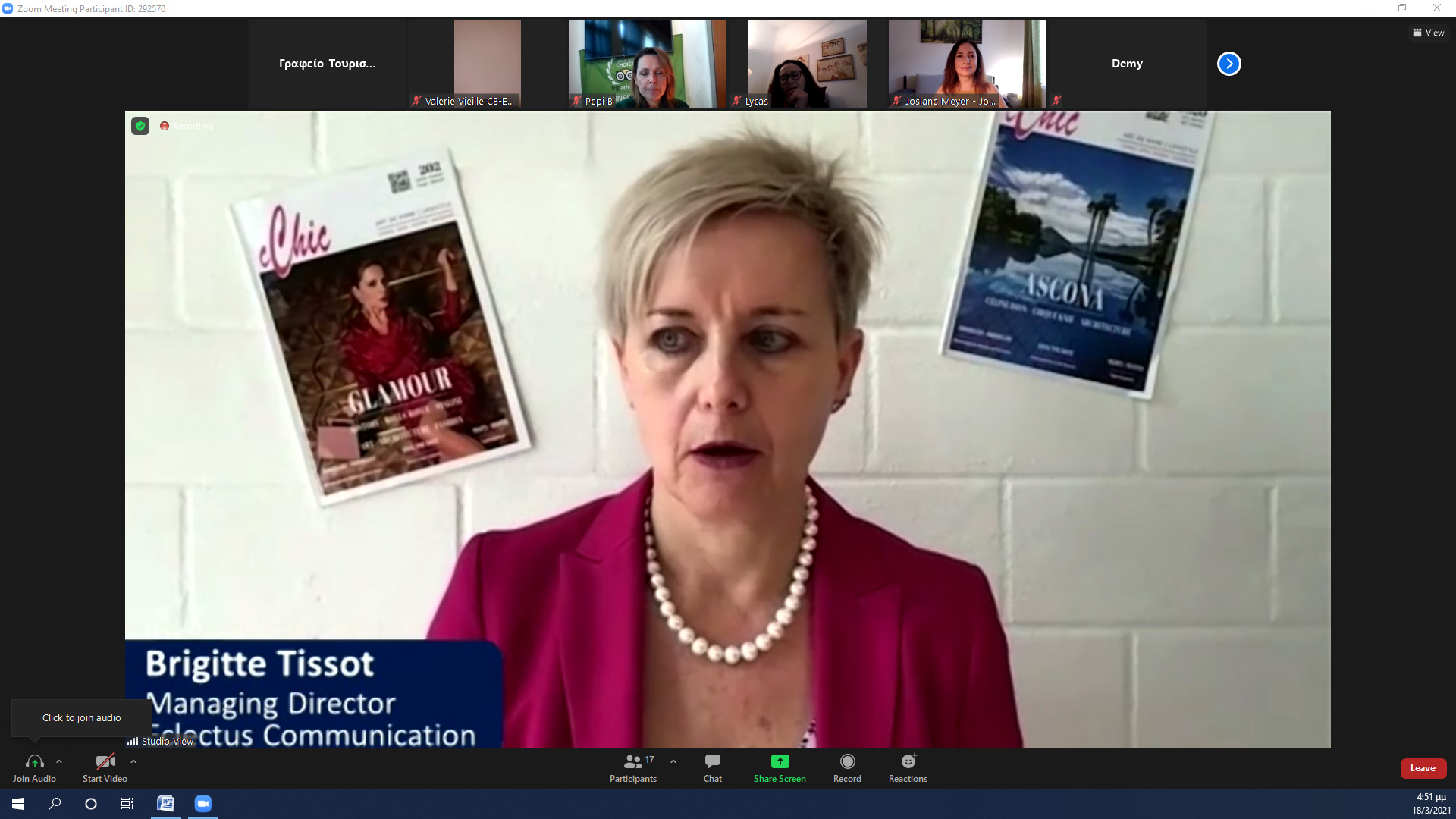 Η αντιδήμαρχος είχε συζητήσεις με τους εκπροσώπους του τουρισμού των χωρών αυτών και τους παρουσίασε το Ρέθυμνο ως τουριστικό προορισμό για όλες τις εποχές του χρόνου, όχι μόνο κατά τη διάρκεια του καλοκαιριού. Τους ανέλυσε τις ομορφιές του τόπου και τις αμέτρητες δραστηριότητες για όλα τα γούστα που μπορεί να κάνει ο κάθε επισκέπτης και τους κάλεσε να έρθουν να επισκεφθούν το Ρέθυμνο και να τα ζήσουν από κοντά.