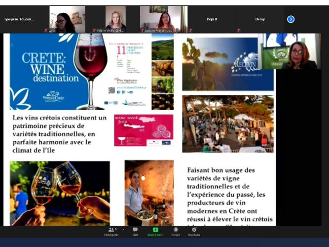 Όπως επεσήμανε η κα Μπιρλιράκη, το Ρέθυμνο προωθεί τον οινογαστρονομικό τουρισμό με τη σύσταση ειδικής ομάδας η οποία βρίσκεται σε συνεργασία με το δίκτυο οινοπαραγωγών Κρήτης, καθώς και με την οργάνωση βιωματικών δράσεων για την προβολή και προώθηση του κρητικού αμπελώνα.
