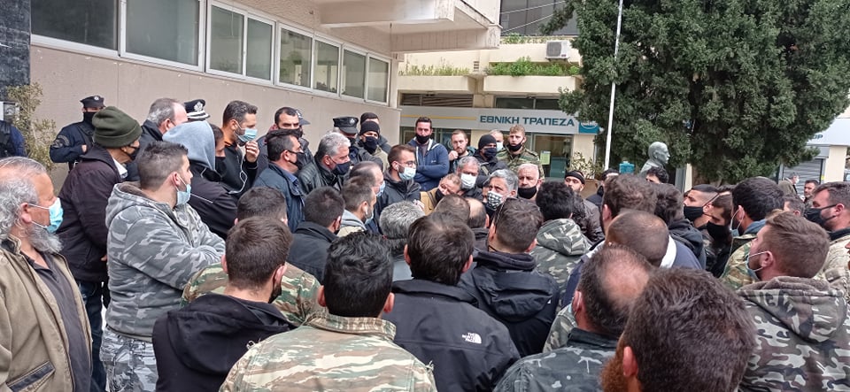 Ανταποκρινόμενος στο κάλεσμα των διαδηλωτών ο Δήμαρχος Ρεθύμνου κ. Γιώργος Μαρινάκης κατέβηκε πριν από λίγα λεπτά στην είσοδο του Δημαρχείου για να συζητήσει με τους διαδηλωτές που έφτασαν εκεί με αίτημα να συζητήσουν το ζήτημα του περιεχομένου των δασικών χαρτών και το αίτημα τους για άμεση απόσυρση τους. Πρόκειται για τους διαδηλωτές που έχουν θέσει από χθες υπό κατάληψη την Διεύθυνση Δασών Ρεθύμνου και ζητούν την στήριξη των θεσμικών εκπροσώπων του Ρεθύμνου στα αιτήματα τους για την απόσυρση και την διόρθωση των αναρτημένων δασικών χαρτών υπέρ των πολιτών. Η συζήτηση γίνεται σε καλό κλίμα και ο δήμαρχος εμφανίζεται να κατανοεί απολύτως τα αιτήματα αγροτών, κτηνοτρόφων και γενικά κάθε ιδιοκτήτη.