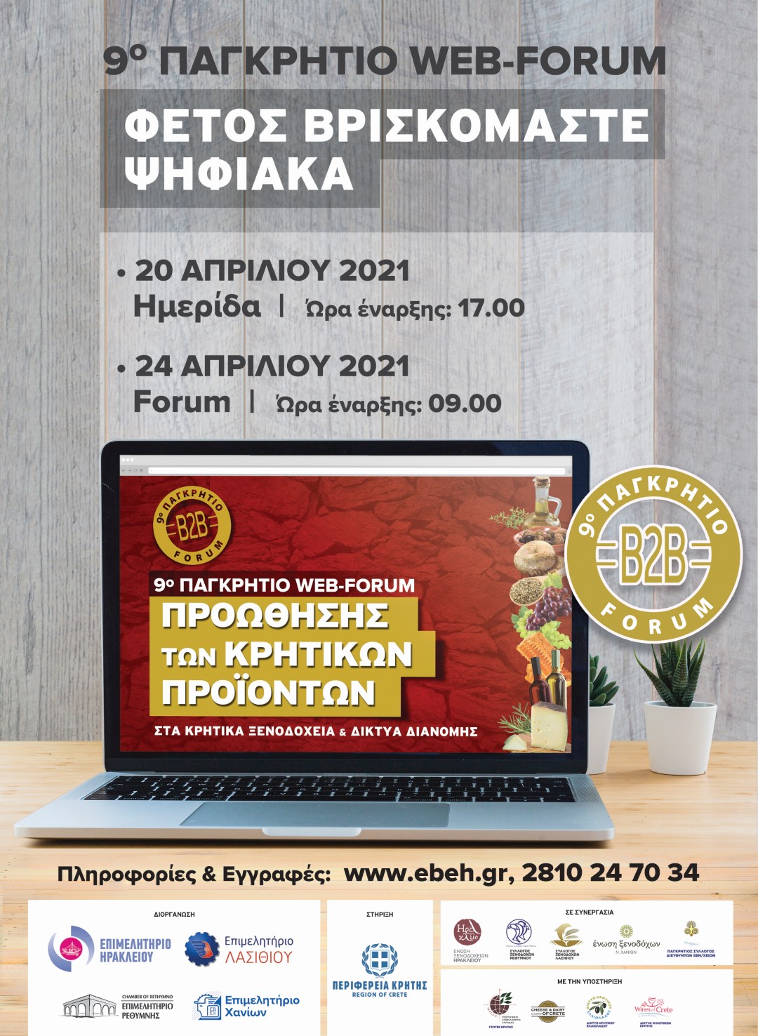 Ενημερωτική Τηλε-ημερίδα διοργανώνουν αύριο, Τρίτη, 20/4 τα τέσσερα Επιμελητήρια Κρήτης, με αφορμή το 9ο ΠΑΓΚΡΗΤΙΟ ΦΟΡΟΥΜ ΠΡΟΩΘΗΣΗΣ ΚΡΗΤΙΚΩΝ ΠΡΟΪΟΝΤΩΝ ΣΤΑ ΚΡΗΤΙΚΑ ΞΕΝΟΔΟΧΕΙΑ ΚΑΙ ΤΑ ΔΙΚΤΥΑ ΔΙΑΝΟΜΗΣ - SUPER MARKEΤ.