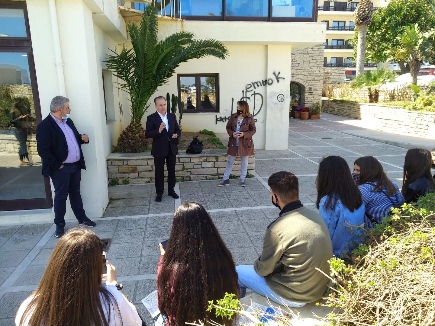 Η συνάντηση που έλαβε χώρα στον προαύλιο χώρο τής Διεύθυνσης Τεχνικών Υπηρεσιών του Δήμου Ρεθύμνης στο κτίριο «Δελφίνι» στη μαρίνα και πραγματοποιήθηκε στο πλαίσιο του Ευρωπαϊκού προγράμματος Erasmus+ «Τουρισμός και Βιωσιμότητα σε Ευρωπαϊκές Παράκτιες Περιοχές», ήταν παρόντες 8 μαθητές της Α’ Λυκείου που συμμετέχουν στο πρόγραμμα, μαζί με τις καθηγήτριες-συνοδούς τους και την υπεύθυνη καθηγήτρια του προγράμματος κα Αναστασία Ρηγάκη.