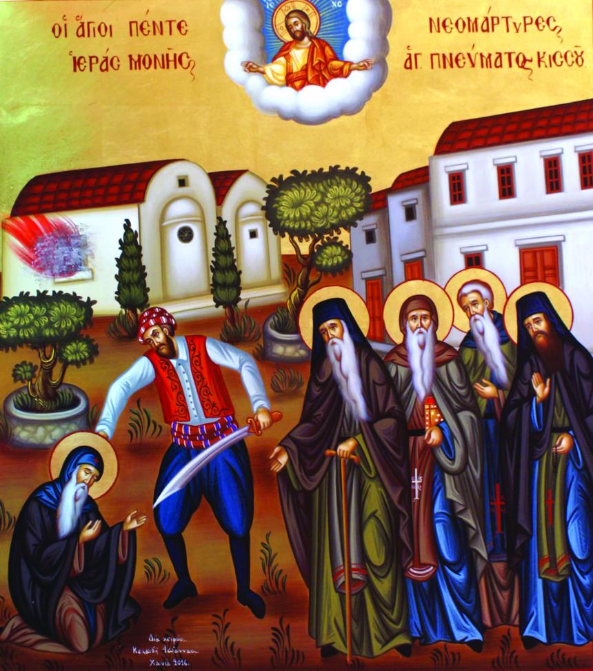 Στις 15 Ιουνίου του 1821, ο φοβερός και αιμοσταγής Αμπαδιώτης Τούρκος, Ντελή Μουσταφάς με τους άντρες του, που όπως αναφέρει η παράδοση «μόνο Γιάννηδες είχε σφάξει 99», ξεκίνησε να καίει και να λεηλατεί τα χωριά του Άη-Βασίλη. Πέρασε από τις Μέλαμπες, τα Ακούμια και τα υπόλοιπα ανατολικά χωριά, σπέρνοντας στο διάβα του τον θάνατο και το όλεθρο. Φτάνοντας στη Μονή του Αγίου Πνεύματος, ολοκλήρωσε το φονικό έργο του, σφάζοντας τον Ηγούμενο και του τέσσερις ανυπεράσπιστους μοναχούς και μετά παρέδωσε στη φωτιά το Μοναστήρι καίγοντάς και καταστρέφοντάς το ολοσχερώς. Μετά την απομάκρυνση του Ντελή Μουσταφά, οι κάτοικοι του Κισσού, βιαστικά, έσκαψαν ένα πρόχειρο τάφο, πίσω ακριβώς από το Άγιο Βήμα του ναού και ενταφίασαν όλους μαζί τους Μοναχούς, χωρίς να τοποθετήσουν ούτε καν έναν σταυρό. Ο ομαδικός αυτός τάφος, με τους πέντε σκελετούς, ανακαλύφθηκε τυχαία το 1895, όταν γίνονταν εργασίες στον προαύλιο χώρο της Μονής. Ο Ντελή Μουσταφάς πλήρωσε τα ανομήματά του την επόμενη μέρα, στις 16 Ιουνίου 1821. Οι αδερφοί Τσουδεροί με τους άντρες τους και άλλους οπλαρχηγούς, μετά τη νικηφόρα μάχη στον Άη Γιάννη τον Καμένο, πληροφορήθηκαν τις βιαιοπραγίες του Αμπαδιώτη Τούρκου και με την προτροπή του Ηγουμένου της Μονής Πρέβελη Μελχισεδέκ Τσουδερού, έτρεξαν και τον πρόλαβαν στον Καψαλέ, έξω από το Σπήλι. Μετά από φονική μάχη, κατάφεραν να συλλάβουν τον Ντελή Μουσταφά και τους δύο γυναικάδελφούς τους, τους οποίους θανάτωσαν στη συνέχεια.