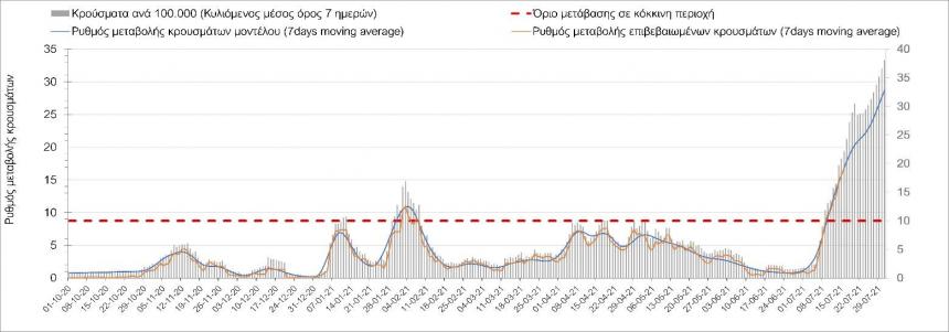"Στο Ηράκλειο, όπου εντοπίστηκαν 112 κρούσματα, παρατηρείται μειωμένος αριθμός σε σχέση με την Πέμπτη και το ανοδικό κύμα που διαμορφώθηκε, ήδη ξεπέρασε κατά πολύ σε ύψος το μέγιστο του 3ου κύματος, που πιθανότατα οφείλεται στο σχετικά μεγάλο αριθμό κρουσμάτων που φέρουν το μεταλλαγμένο στέλεχος Δ Στα Χανιά με 49 κρούσματα έχουμε αυξημένο αριθμό κρουσμάτων σε σχέση με την Πέμπτη και πλέον και εδώ έχει διαμορφωθεί έντονα ανοδική πορεία, η οποία έφερε τα Χανιά αρκετά πάνω από το όριο χαρακτηρισμού ως κόκκινη περιοχή, με ύψος 4ου κύματος που ξεπέρασε ήδη τα 3 προηγούμενα. Μειωμένος αριθμός κρουσμάτων παρατηρείται στο Ρέθυμνο με 91 κρούσματα, όπου παρατηρείται ένα πολύ έντονα ανοδικό κύμα (Σχήμα 47), το οποίο είναι ήδη 4 φορές ψηλότερο από το 3ο κύμα. Στο Λασίθι παρατηρείται μεγαλύτερος αριθμός κρουσμάτων σχέση με την Πέμπτη, καθώς εντοπίστηκαν 23 κρούσματα, με αποτέλεσμα και σε αυτήν την περιοχή να έχει διαμορφωθεί πολύ έντονα ανοδική τάση.