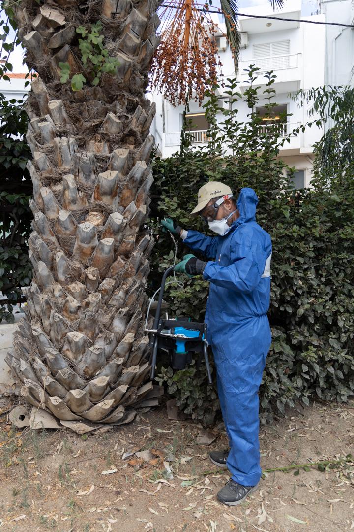 Και εξήγησε: «Η εφαρμογή μπορεί να γίνει: Άνοιξη (από Μάρτιο έως και Ιούνιο) ή Φθινόπωρο (από Σεπτέμβριο έως μέσα Νοεμβρίου). Το εντομοκτόνο αυτό, εφαρμόζεται χαμηλά στον κορμό και κινείται ανοδικά μαζί με τους χυμούς. Η εφαρμογή πρέπει να γίνεται σε φοίνικες που δεν έχουν υποστεί πρόσφατα (τουλάχιστον 2 με 3 εβδομάδες) λειψυδρία».