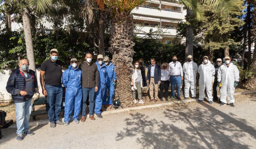 Ο ίδιος, στη συνέχεια τόνισε ότι συζητήθηκε ο τρόπος που εξασφαλίζεται η προστασία του περιβάλλοντος, των δημοτών και των επισκεπτών: «Η ανάθεση έγινε στην Αγροτικό Σπίτι Παπαγεωργίου ΑΕ και η οποία παρείχε τους ειδικά εκπαιδευμένους εφαρμοστές. Πέραν των ειδικών επιστημονικών θεμάτων σχετικά με τον τρόπο λειτουργίας της εφαρμογής, συζητήθηκε το πως εξασφαλίζεται η προστασία του περιβάλλοντος, των δημοτών και των επισκεπτών. Δεν υπάρχει έκθεση της δραστικής στο περιβάλλον ή στον εφαρμοστή κατά την διαδικασία της μικροέγχυσης (κλειστό σύστημα μεταφοράς), καθώς το σκεύασμα εισάγεται απ’ ευθείας στον κορμό του φοίνικα».