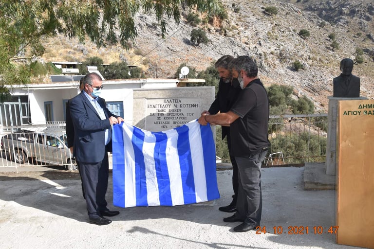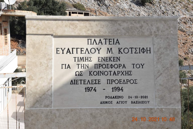 Για όλα τα παραπάνω ο Δήμος Αγίου Βασιλείου μετά από εισήγηση των τοπικών παραγόντων ένδειξη ευγνωμοσύνης στην μνήμη του δίνει την ονομασία της Πλατείας στο Πάνω Ροδάκινο σε Πλατεία Ευάγγελου Μανούσου Κοτσιφη με βάσει την υπ’ αριθμό 42/2021 απόφασης του Δημοτικού Συμβουλίου, για την συνολική προσφορά του στο Ροδάκινο ως Κοινοτάρχη.