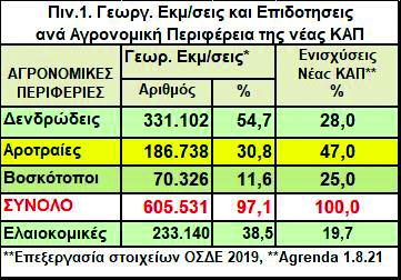 2.Οι ενισχύσεις που προβλέπονται για τους ελαιοπαραγωγούς είναι αντιστρόφως ανάλογες με τον συνολικό αριθμό τους. Αυτό φαίνεται καθαρά από στοιχεία του ΟΣΔΕ (Πιν.1) σύμφωνα με τα οποία οι ελαιοκομικές εκμεταλλεύσεις ενώ αποτελούν το 40% περίπου του συνόλου των γεωργικών εκμεταλλεύσεων της χώρας απολαμβάνουν μόνο το 20% περίπου του συνόλου των ενισχύσεων.