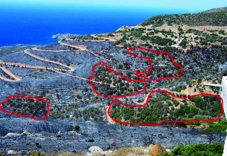 Θύματα πυρκαγιών οι ακαλλιέργητοι ελαιώνες επικλινών περιοχών, αλλά σώοι (μέσα σε κόκκινο) οι καλλιεργημένοι! |