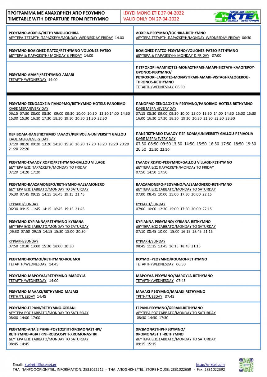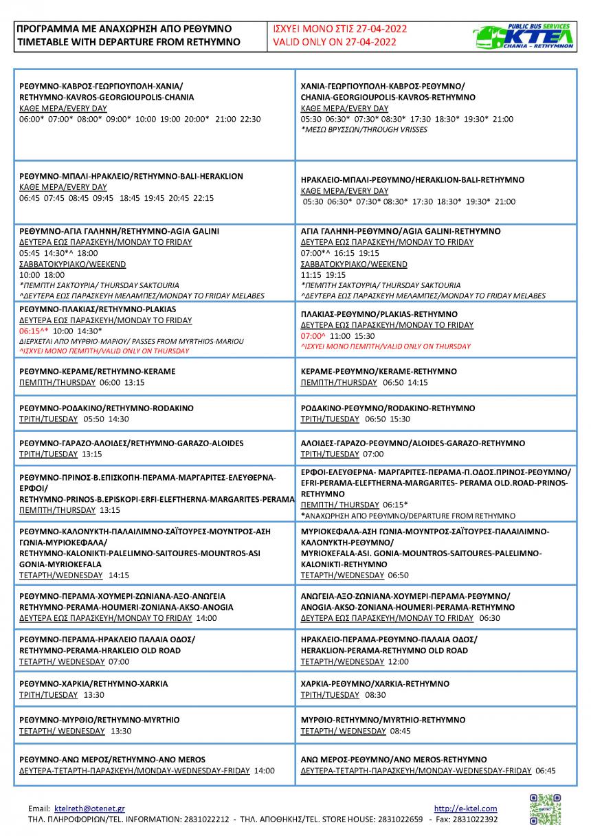 Ενημερώνουμε το επιβατικό μας κοινό ότι τροποποιούνται εκτάκτως τα δρομολόγια της Τετάρτης 27-04-2022 μετά την υπ’ αρ. πρωτ. 2517/05/17-στ/20-04-2022 απόφαση της Διεύθυνσης Αστυνομίας Χανίων, που εκδόθηκε στα πλαίσια της διεξαγωγής του ¨1ου Ε.Τ.Α.Π. του Διεθνούς Ποδηλατικού Γύρου Ελλάδος¨.