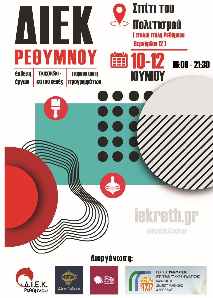Η Διεύθυνση, ο Σύλλογος Διδασκόντων και οι Καταρτιζόμενοι του Δημόσιου ΙΕΚ Ρεθύμνου διοργανώνουν σειρά εκδηλώσεων από την Παρασκευή 10 Ιουνίου 2019 έως την Κυριακή 12 Ιουνίου 2022, στο Σπίτι του Πολιτισμού (Βερνάδου 12, Παλιά πόλη).