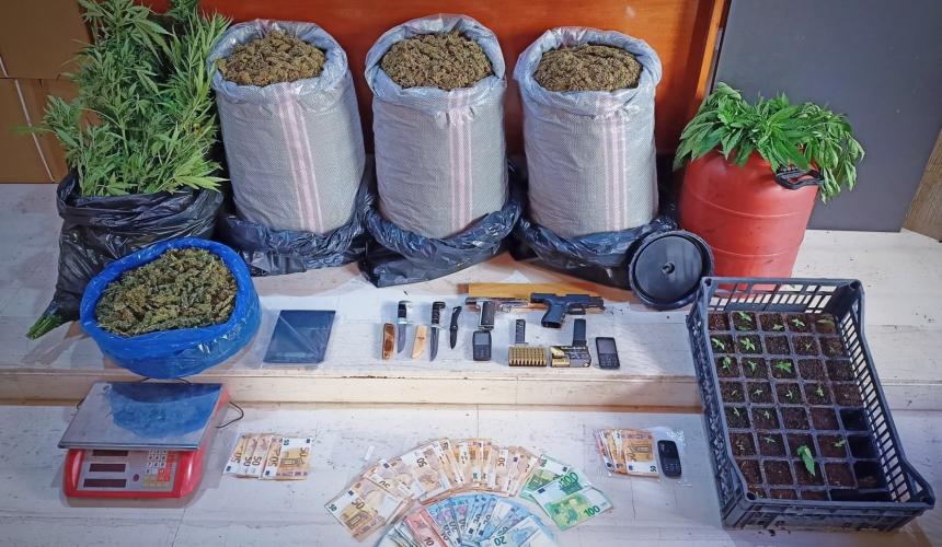 Κατασχέθηκαν περισσότερα από 25 κιλά κάνναβης, 73 δενδρύλλια κάνναβης, 2 πιστόλια με τους γεμιστήρες τους, φυσίγγια και το χρηματικό ποσό 3.985 ευρώ
