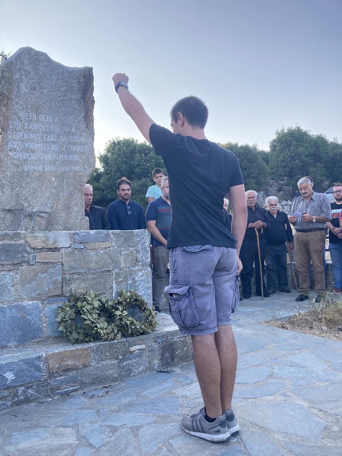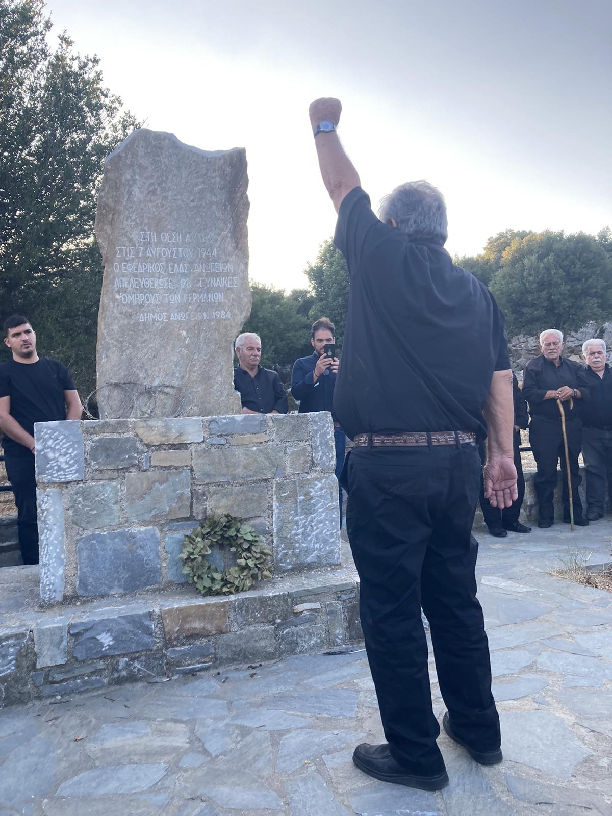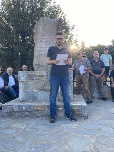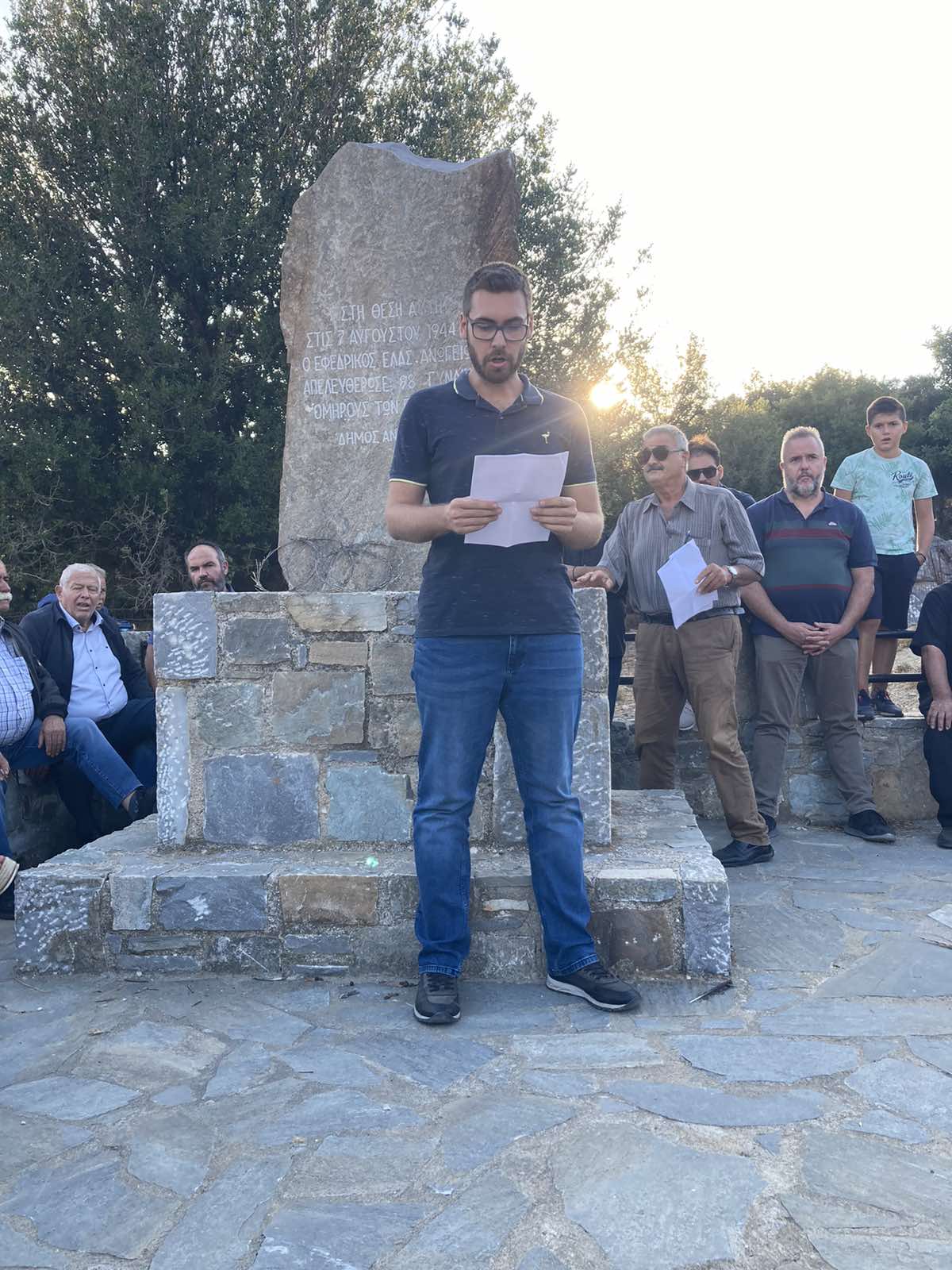 Εκ μέρους της ΠΕΑΕΑ-ΔΣΕ μίλησε ο Αντώνης Ρούλιος ο οποίος αναφέρθηκε στα γεγονότα της μάχης, κατά την οποία το δεκαμελές τμήμα του ΕΛΑΣ των Ανωγείων με επικεφαλή το Μανόλη Μανουρά (Σμαϊλομανόλη) αιφνιδίασε και εξουδετέρωσε το γερμανικό απόσπασμα που είχε αιχμαλωτίσει 98 γυναικόπαιδα από τα Ανώγεια με σκοπό να τα μεταφέρει στο Ρέθυμνο και από εκεί στα στρατόπεδα συγκέντρωσης της Γερμανίας. Ο ομιλητής επεσήμανε την ανάγκη διατήρησης της ιστορικής μνήμης της ηρωικής Εθνικής Αντίστασης και την ανάγκη μαχητικής απόκρουσης της αναθεώρησης της ιστορίας της δεκαετίας του 1940.