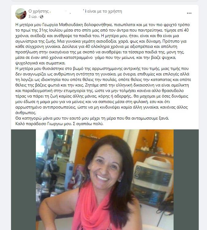 Η μητέρα μου Γεωργία Μαθιουδάκη δολοφονήθηκε, πισωπλατα και με τον πιο φριχτό τρόπο το πρωί της 31ης Ιουλίου μέσα στο σπίτι μας από τον άντρα που παντρεύτηκε, τίμησε επί 40 χρόνια, ανέδειξε και ανέθρεψε τα παιδιά του. Η μητέρα μου, ήταν, είναι και θα είναι μια αγωνίστρια της ζωής. Μια γυναίκα γεμάτη αισιοδοξία, χαρά, φως και δύναμη. Πρότυπο για κάθε σύγχρονη γυναίκα. Δούλευε για 40 ολόκληρα χρόνια με αξιοπρέπεια και απόλυτη προσήλωση στην οικογένεια της με σκοπό να αναθρέψει τα τέσσερα παιδιά της, μονη της, μέσα σε έναν από χρόνια κατεστραμμένο γάμο που την μείωνε, και την βίαζε ψυχικα, ψυχολογικά και σωματικα.