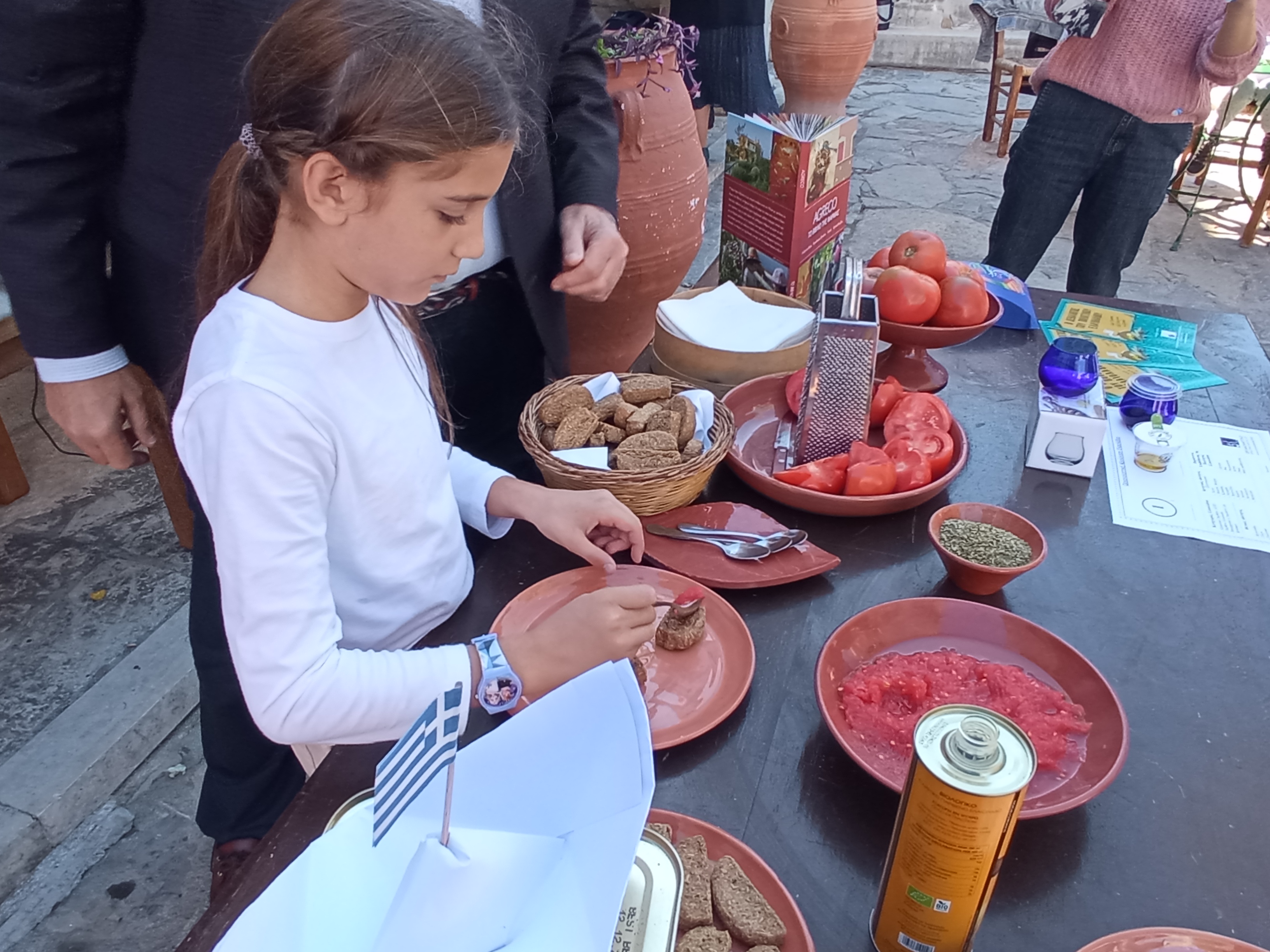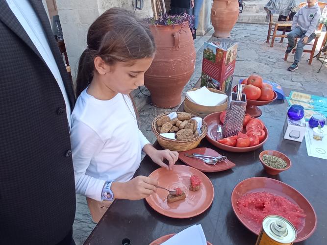 Τα παιδιά παρακολούθησαν επίσης ένα σχετικό βίντεο και ακολούθως με την παρότρυνση του κ. Δημήτρη Καλαϊτζιδάκη και της συμμαθήτριας τους Όλγας Καλαϊτζιδάκη, έμαθαν να παρασκευάζουν κρητικό ντάκο με ντομάτα, φέτα, ρίγανη και λάδι.