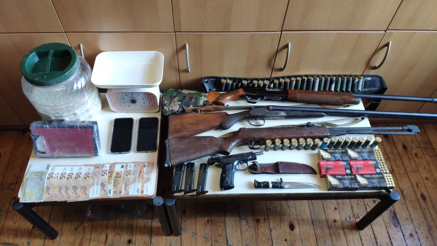 Επιπλέον, κατασχέθηκαν πιστόλι, κυνηγετικά όπλα, γεμιστήρες, φυσίγγια και κινητά τηλέφωνα