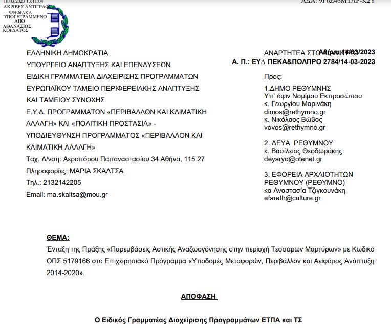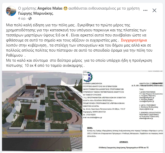 Σύμφωνα με ανάρτηση του αντιδημάρχου Τεχνικών Υπηρεσιών του δήμου Ρεθύμνου Άγγελου Μαλά, «εγκρίθηκε το πρώτο μέρος της χρηματοδότησης για την κατασκευή του υπόγειου παρκινγκ και της πλατείας των Τεσσάρων Μαρτύρων ύψους 9,6 εκ ευρώ»
