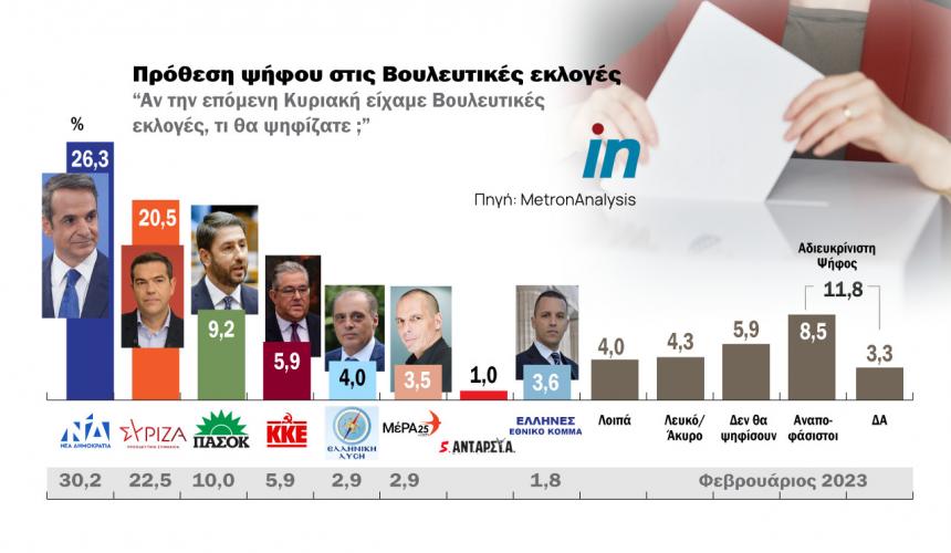 Η αδιευκρίνιστη ψήφος βρίσκεται στο 11,8%, 5,9% λένε ότι δεν θα ψηφίσουν, 4,3% δηλώνουν άκυρο – λευκό ενώ τα λοιπά κόμματα είναι στο 4%.