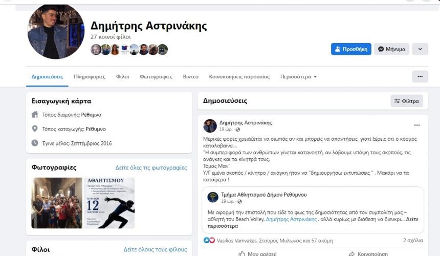 Ο νεαρός Δημήτρης Αστρινάκης σε ανάρτηση του στο προσωπικό του προφίλ στο facebook διαμαρτυρήθηκε για την πρόθεση του δήμου να βραβεύσει τους αθλητές του Beach Volley για τις επιτυχίες τους, όταν δεν τους διαθέτει τους κατάλληλους χώρους άθλησης.