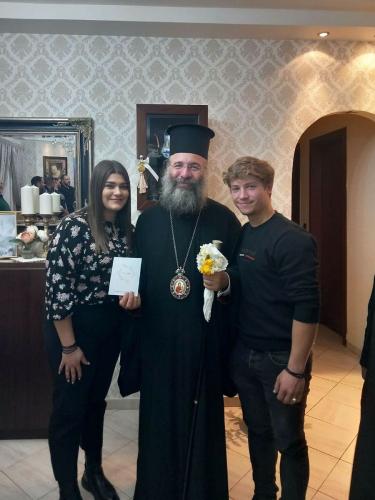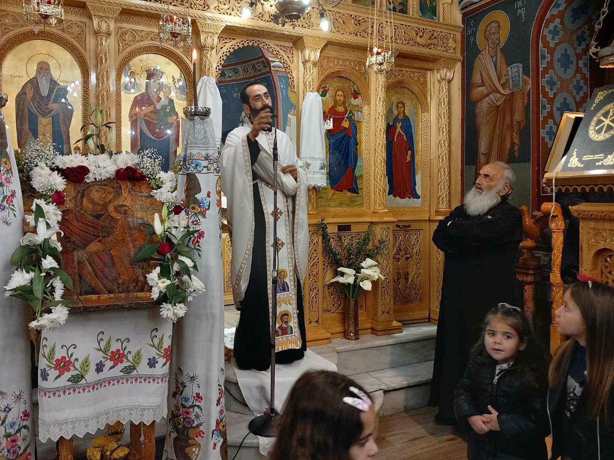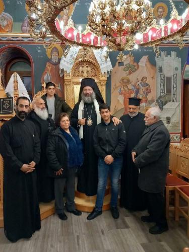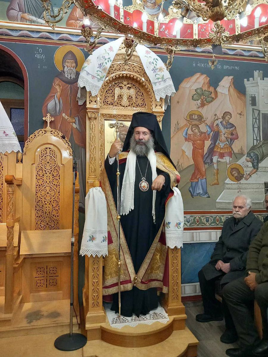 Ο Επίσκοπός μας έτυχε λαμπρής υποδοχής, κατά την παράδοση του τόπου, από τον Εφημέριο της Ενορίας, Αιδεσ. Πρωτοπρεσβύτερο Ματθαίο Ζερβό, τον κατά σάρκα πατέρα του και προκάτοχό του στην Ενορία, Αιδεσ. Πρωτοπρεσβύτερο Αθανάσιο Ζερβό, τον Αρχιερατικό Επίτροπο της Ε΄ Αρχιερατικής Περιφερείας της Ιεράς Μητροπόλεώς μας, Αιδεσ. Πρωτοπρεσβύτερο Γεώργιο Μυρθιανό, τον Εφημέριο της Ενορίας Λιβαδίων Μυλοποτάμου, Αιδεσ. Πρωτοπρεσβύτερο Ανδρέα Κόκκινο, και πλήθος πιστών, μεταξύ των οποίων πολλά παιδιά του χωριού.