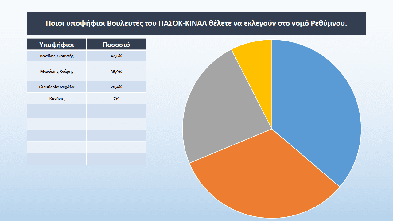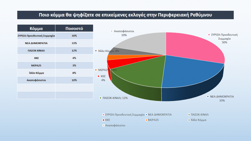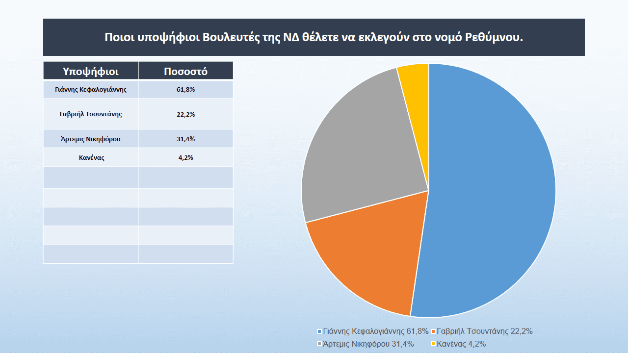 Στις κάρτες που ακολουθούν μπορείτε να δείτε αναλυτικά τα ευρήματα για την Π.Ε. Ρεθύμνου, όπως καταγράφηκαν στην δημοσκόπηση που έγινε για λογαριασμό της εφημερίδας «ΕΠΕΝΔΥΤΗΣ» (iependitis.gr) και διενεργήθηκε από την εταιρεία Infocall μεταξύ 24-28 Απριλίου 2023.