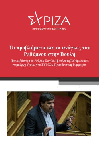 Έχουμε αναδείξει στη Βουλή τα προβλήματα και τις ανάγκες του Ρεθύμνου και των ανθρώπων του (βλ. σχετική έκδοση).Οι παρεμβάσεις αυτές στην ουσία αποτελούν ένα «άτυπο» τοπικό πρόγραμμα και μια ισχυρή πολιτική δέσμευση των ιεραρχήσεων της νέας προοδευτικής διακυβέρνησηςγια τον τόπο μας. Και οι 5 άξονες (Πρωτογενής Τομέας, Τοπική Ανάπτυξη, Δημόσια Υγεία, Εκπαίδευση, Κοινωνική Συνοχή) δίνουν το «στίγμα» μιας αναπτυξιακής στρατηγικής που διασφαλίζει οικονομική βιωσιμότητα, περιβαλλοντική προστασία και συλλογική κοινωνική ευημερία.Η τελευταία παράμετρος, είναι το όραμα για το Ρέθυμνο του μέλλοντος. Μόνο που αυτό απαιτεί υπέρβαση της εδραιωμένης νοοτροπίας εξυπηρέτησης προσωπικών συμφερόντων και πελατειακώνσχέσεων. Απαιτεί«κλειστές πόρτες» στις κοινωνικές παθογένειας που μας ενοχλούν και μας προσβάλλουν,μέτωπο απέναντι στην ανομίακαι παραβατικότητα, αλλά ανοιχτό δίαυλο επικοινωνίαςκαι συστηματική διαβούλευση με τους τοπικούς φορείς,με τις παραγωγικές δυνάμεις και την υγιή επιχειρηματικότητα της περιοχής,με τις συλλογικότητες και τους ενεργούς πολίτες, με τους νέους ανθρώπους. Ένα Ρέθυμνο με ποιότητα ζωής και συλλογική αξιοπρέπεια, είναι αυτό που μας αξίζει.