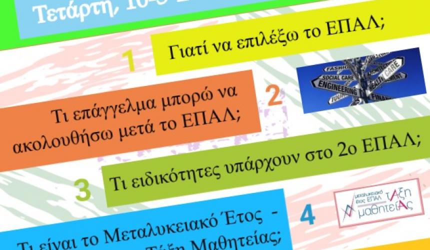 Το 2ο ΕΠΑΛ Ρεθύμνου ανταποκρινόμενο στο έντονο ενδιαφέρον για φοίτηση μαθητών/τριών στα Επαγγελματικά Λύκεια, προσκαλεί γονείς και μαθητές να παραβρεθούν σε ενημερωτική εκδήλωση την Τετάρτη 10 Μαΐου 2023 και ώρα 18:00 στο χώρο του σχολείου, (Κόμβος Ατσιπόπουλου).