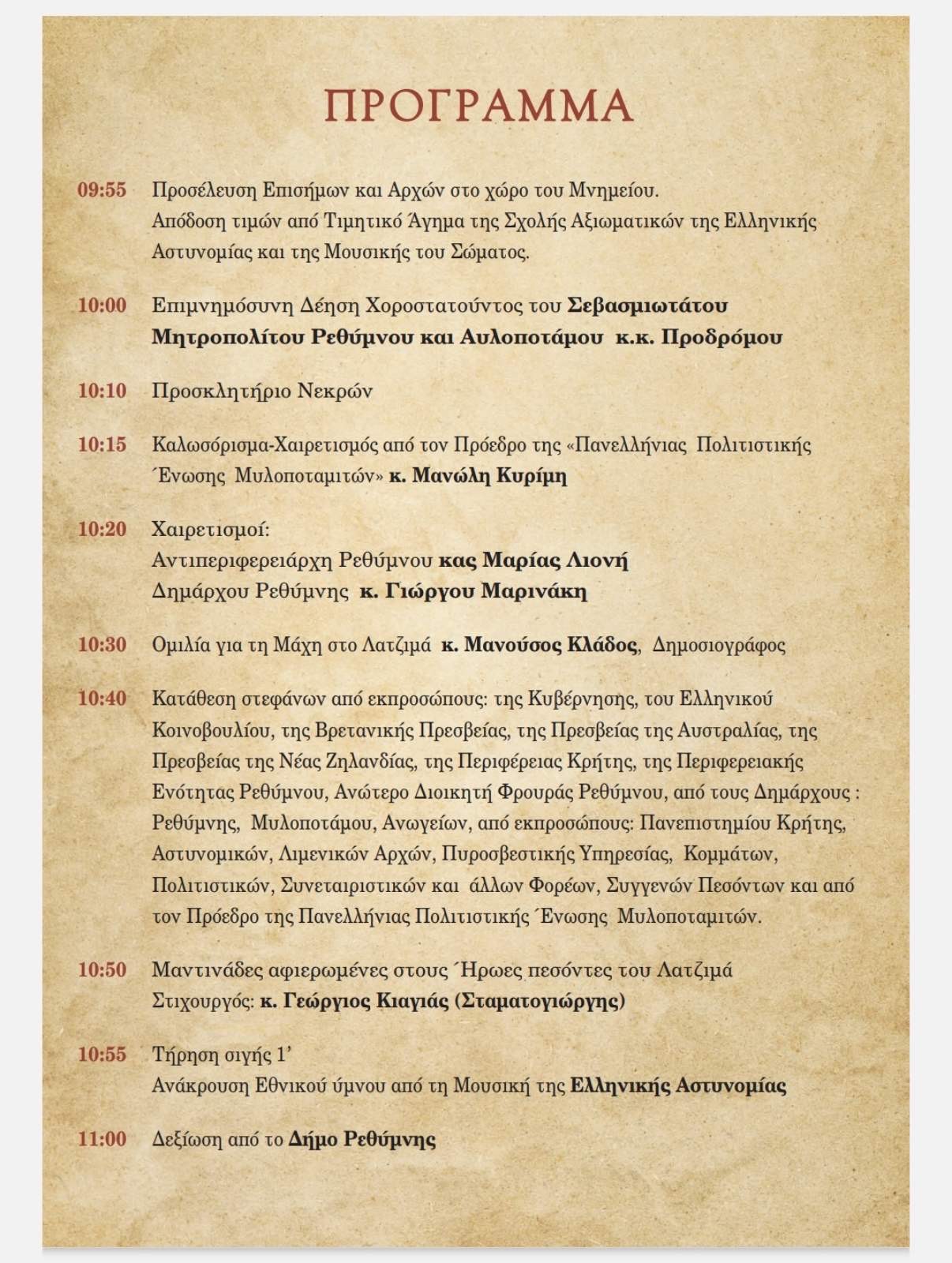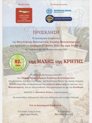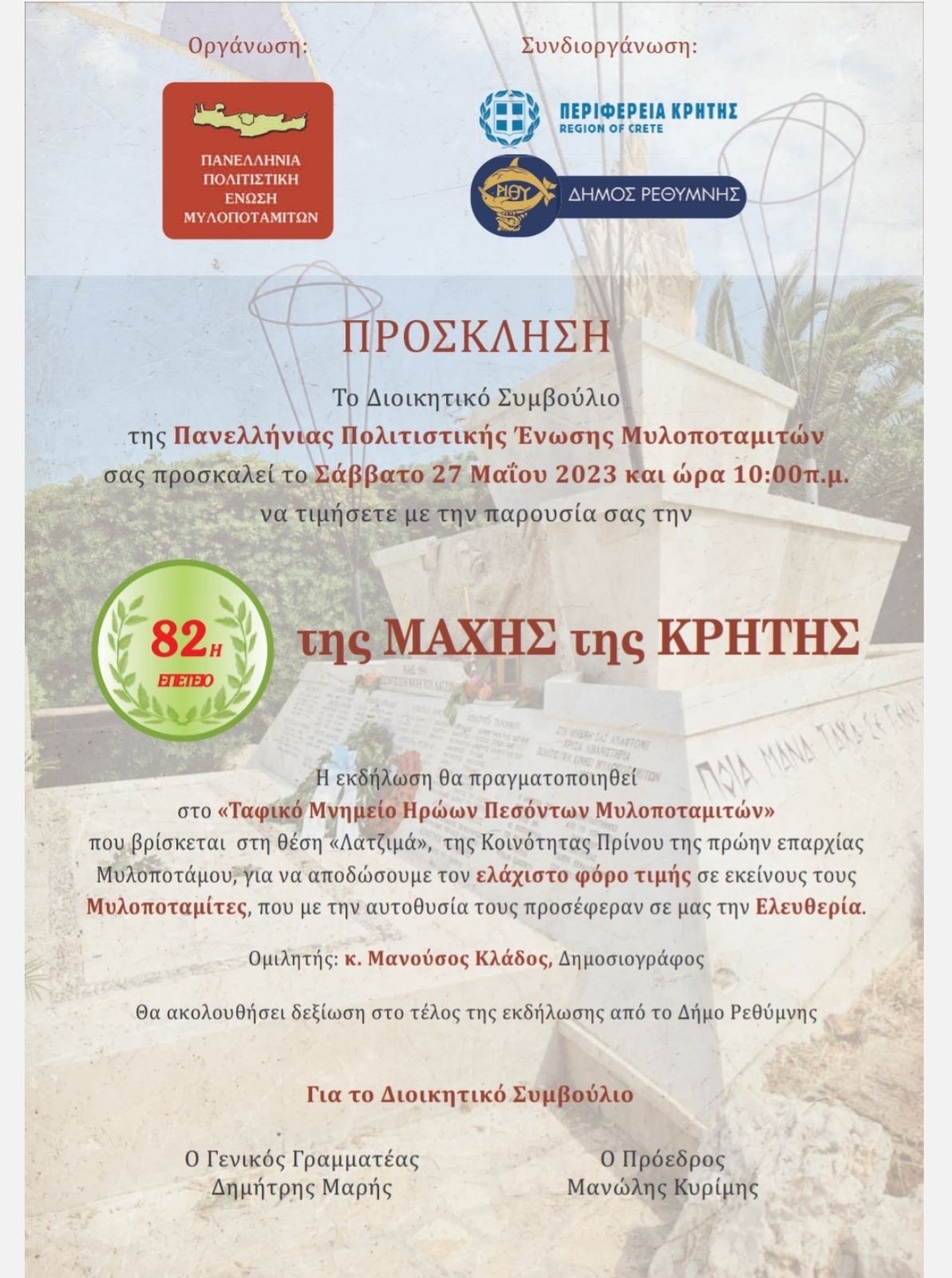 Η Πανελλήνια Πολιτιστική Ένωση Μυλοποταμιτών, σε συνεργασία με την Περιφέρεια Κρήτης, το Δήμο Ρεθύμνης, την Κοινότητα Πρίνου, τον Πολιτιστικό Σύλλογο Πρίνου και την Ενορία Πρίνου, θα τιμήσει την 82η επέτειο της Μάχης της Κρήτης στις 27 Μαΐου 2023, ημέρα Σάββατο και ώρα 10:00 π.μ. στο «Ταφικό Μνημείο Ηρώων Πεσόντων Μυλοποταμιτών» που βρίσκεται στη θέση «Λατζιμά», της Κοινότητας Πρίνου της πρώην επαρχίας Μυλοποτάμου.