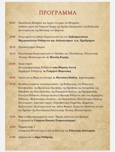 Στην εκδήλωση έχουν προσκληθεί και θα παραστούν: ο Σεβασμιώτατος Μητροπολίτης Ρεθύμνης και Αυλοποτάμου κ.κ. Πρόδρομος, Κληρικοί, εκπρόσωποι της Κυβέρνησης, της Αξιωματικής Αντιπολίτευσης, Κομμάτων, της Περιφέρειας Κρήτης, των Δήμων και του Στρατού, οι πρέσβεις: Βρετανίας, Αυστραλίας και Νέας Ζηλανδίας, οι Αρχές του Νομού, Άγημα με την Ελληνική Σημαία και τη Μoυσική της Ελληνικής Αστυνομίας, εκπρόσωποι Πολιτιστικών, Συνεταιριστικών και άλλων φορέων, καθώς και πλήθος κόσμου.