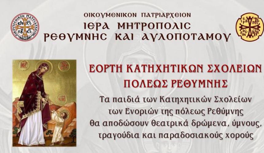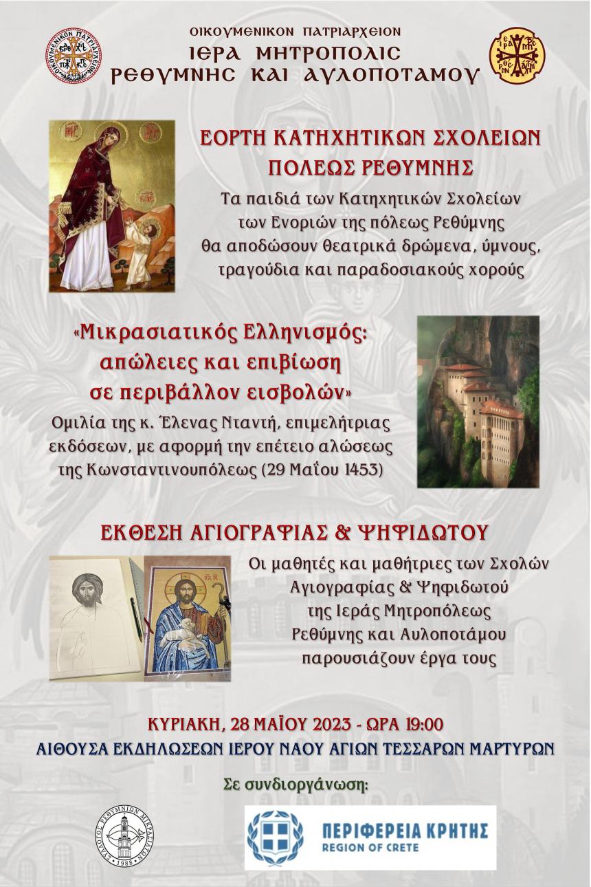 Ανακοινώνεται ότι, λόγω των επισφαλών καιρικών συνθηκών, η εκδήλωση των Κατηχητικών Σχολείων των Ενοριών της πόλεως Ρεθύμνης, καθώς και η ομιλία της κ. Έλενας Νταντή με θέμα «Μικρασιατικός Ελληνισμός: απώλειες και επιβίωση σε περιβάλλον εισβολών», θα πραγματοποιηθούν την Κυριακή, 28η Μαΐου 2023, από ώρας 19:00, στην Αίθουσα Εκδηλώσεων του Ιερού Ναού των Αγίων Τεσσάρων Μαρτύρων της πόλεως Ρεθύμνης.