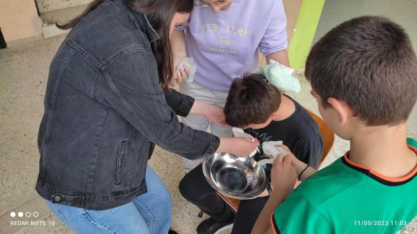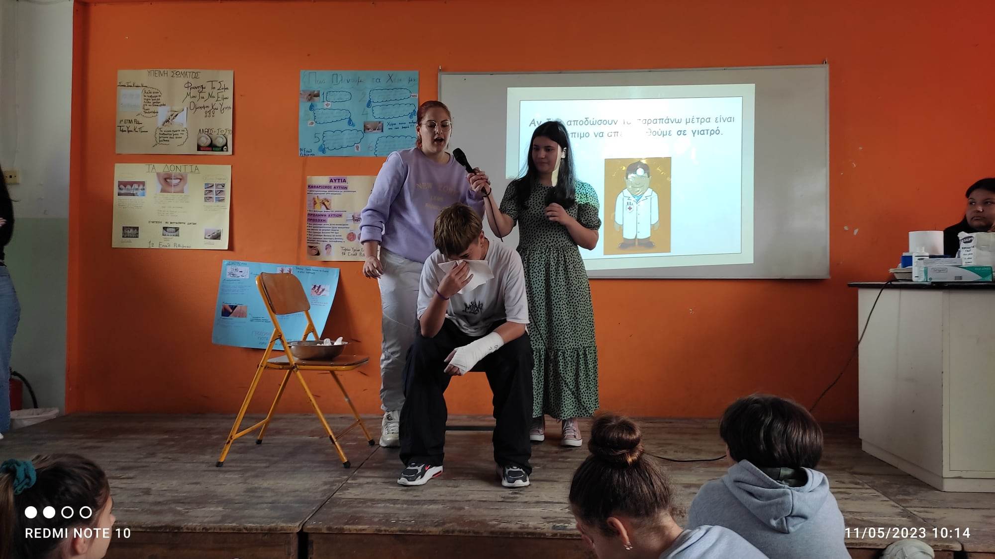 Στo πλαίσιο Προγράμματος Αγωγής Υγείας με θέμα τη Σωματική Υγεία, πραγματοποιήθηκαν επισκέψεις από τους μαθητές και μαθήτριες του 1ου ΕΚ – 1ου ΕΠΑΛ Ρεθύμνου, Τομέα Υγείας Πρόνοιας και Ευεξίας στην ειδικότητα της νοσηλευτικής, στο 8ο Δημοτικό Σχολείο στα Περιβόλια. Στις επισκέψεις αυτές τα παιδιά του 1ου ΕΚ – 1ου ΕΠΑΛ μετέφεραν στους μικρούς μαθητές και μαθήτριες με τρόπο βιωματικό και διαδραστικό, τις γνώσεις που αποκόμισαν από το πρόγραμμα, πάνω σε θέματα ατομικής υγιεινής και Πρώτων Βοηθειών. Πιο συγκεκριμένα, τα παιδιά της Α, Β ,Γ, και Δ τάξης του 8ου Δ. Σ. εκπαιδεύτηκαν σε θέματα που αφορούν στην «ατομική υγιεινή». Έμαθαν πως γίνεται η σωστή ατομική καθαριότητα του σώματος, του κεφαλιού, των ματιών και των αυτιών. Επιπλέον, είχαν την ευκαιρία να εξασκηθούν στην πράξη στο σωστό πλύσιμο των χεριών και των δοντιών. Τα παιδιά των μεγαλύτερων τάξεων, Ε΄ και ΣΤ΄, ασχολήθηκαν με τα «Ατυχήματα και Πρώτες Βοήθειες στο χώρο του σχολείου». Εκπαιδεύτηκαν στην αντιμετώπιση των αιμορραγιών με έμφαση στη ρινορραγία. Ενημερώθηκαν για τις μυοσκελετικές κακώσεις και, σε ομάδες, έκαναν την απαραίτητη περίδεση άκρου ποδός που γίνεται σε περίπτωση διαστρέμματος. Τέλος, εξασκήθηκαν στην αντιμετώπιση πνιγμονής από ξένο σώμα με χειρισμό Heimlich, με τη χρήση προπλάσματος.