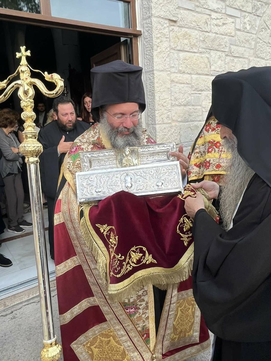 Ο Σεβασμιώτατος Μητροπολίτης Ρεθύμνης και Αυλοποτάμου κ. Πρόδρομος, με πνευματική χαρά και συγκίνηση, υποδέχθηκε το ιερό λείψανο, το οποίο για δεύτερη φορά, μετά από δεκαετία και πλέον, έρχεται προσκυνηματικώς και ευλογητικώς στην Ιερά Μητρόπολή μας, και ευχαρίστησε εγκάρδια τον εκπρόσωπο της Ιεράς Μονής Γρηγορίου, Ιερομόναχο Παΐσιο Γρηγοριάτη, καθώς και τον Καθηγούμενο της Ιεράς Μονής Αγίας Αναστασίας της Ρωμαίας, Πανοσιολ. Αρχιμανδρίτη Βασίλειο Παπαδάκη.
