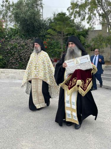 Προ της απολύσεως του Εσπερινού, ο Καθηγούμενος π. Βασίλειος εξέφρασε τις ευγνώμονες ευχαριστίες του για τη μεγάλη αυτή ευλογία για την Ιερά Μονή και αναφέρθηκε στην τιμητική προσκύνηση των αγίων λειψάνων και εν γένει στην περί των ιερών λειψάνων και των Αγίων θεολογία της Εκκλησίας μας.