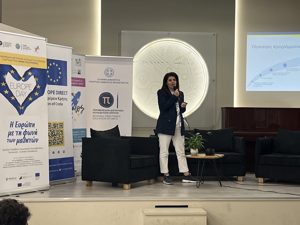 Στη συνέχεια, το 2ο ΕΠΑΛ Ρεθύμνου συμμετείχε στην εκδήλωση που διοργάνωσε για την Ημέρα της Ευρώπης η Περιφερειακή Διεύθυνση Εκπαίδευσης Κρήτης στο Ηράκλειο με τίτλο «Η Ευρώπη με την φωνή των μαθητών». Στη συγκεκριμένη δράση παρουσιάστηκαν οι δράσεις που πραγματοποίησε το σχολείο καθ’ όλη τη διάρκεια της σχολικής χρονιάς, στα πλαίσια του Προγράμματος Υποψήφιο Σχολείο Πρέσβης. Έγινε διάχυση των αποτελεσμάτων και ακολούθησε συζήτηση για τον τρόπο υλοποίησης του προγράμματος, τα οφέλη και τις ευκαιρίες που προσφέρει η συμμετοχή των μαθητών στην υλοποίηση του προγράμματος.