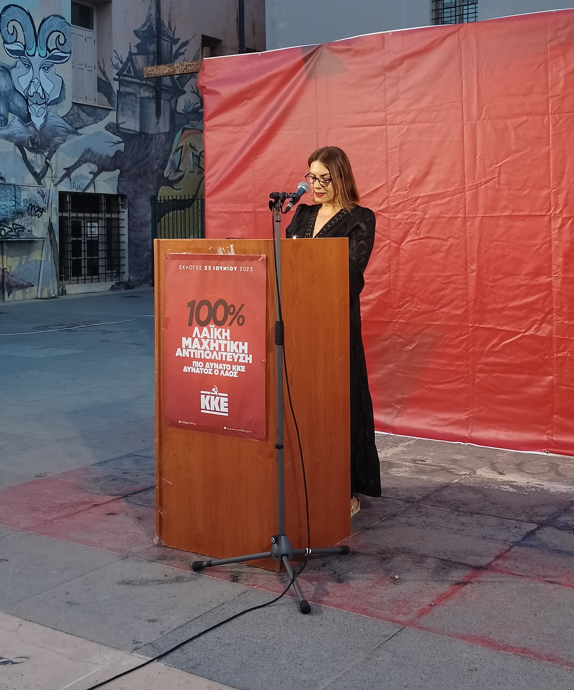 Στη συγκέντρωση χαιρετισμό απηύθυνε η υποψήφια βουλευτής του κόμματος στο νομό Ιωάννα Δακανάλη η οποία τόνισε πως το ΚΚΕ είναι το απάγκιο του φτωχού εργάτη, του εποχικού εργαζόμενου στα κάτεργα του τουρισμού, του μικρομεσαίου αγρότη και κτηνοτρόφου, του αυτοαπασχολούμενου, των αγωνιζόμενων καλλιτεχνών, των υγειονομικών που δεν συμβιβάζονται με την εμπορευματοποίηση του δημόσιου συστήματος υγείας, των εκπαιδευτικών που με χίλια εμπόδια προσπαθούν να μορφώσουν τα παιδιά του λαού. Η ανάπτυξη που ευαγγελίζονται όλα τα αστικά κόμματα είναι για τους λίγους καθώς για το λαό μεταφράζεται σε διαλυμένα ωράρια και εργασιακές σχέσεις, ακρίβεια, ενεργειακή φτώχεια, διάλυση της υγείας και της πρόνοιας. Γι’ αυτό το λόγο και η μόνη απάντηση που πρέπει να δώσει ο λαός στις 25 του Ιουνίου είναι η αποφασιστική άνοδος, σε ψήφος και ποσοστό, του ΚΚΕ.