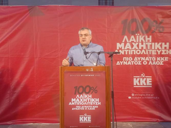 Ο Κώστας Παπαδάκης ξεκίνησε την ομιλία του καταγγέλλοντας το άγριο έγκλημα του ναυαγίου της Πύλου. Όπως χαρακτηριστικά ανέφερε, το ΚΚΕ δεν πρόκειται να συμβιβαστεί ποτέ με το να χάνονται μωρά και μικρά παιδιά με τις μανάδες τους κλεισμένοι σε ένα αμπάρι στον πάτο της θάλασσας. Δεν πρόκειται να αποδεχτούμε ποτέ ως φυσικό φαινόμενο τους ιμπεριαλιστικούς πολέμους, την καταστολή και τους διωγμούς, τις απελάσεις, τις επαναπροώθησεις, την Frontex και τους φράχτες. Δεν θα διαλέξουμε αθλιότητα με την οποία «μπορούν» να έρχονται αντιμέτωποι οι κατατρεγμένοι: είτε με τα διαχρονικά ναυάγια, είτε με τα αίσχη τύπου Μόριας επί ΣΥΡΙΖΑ ή σύγχρονα στρατόπεδα συγκέντρωσης επί ΝΔ.