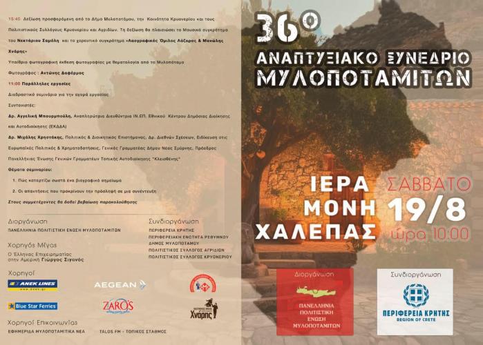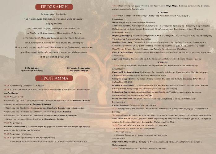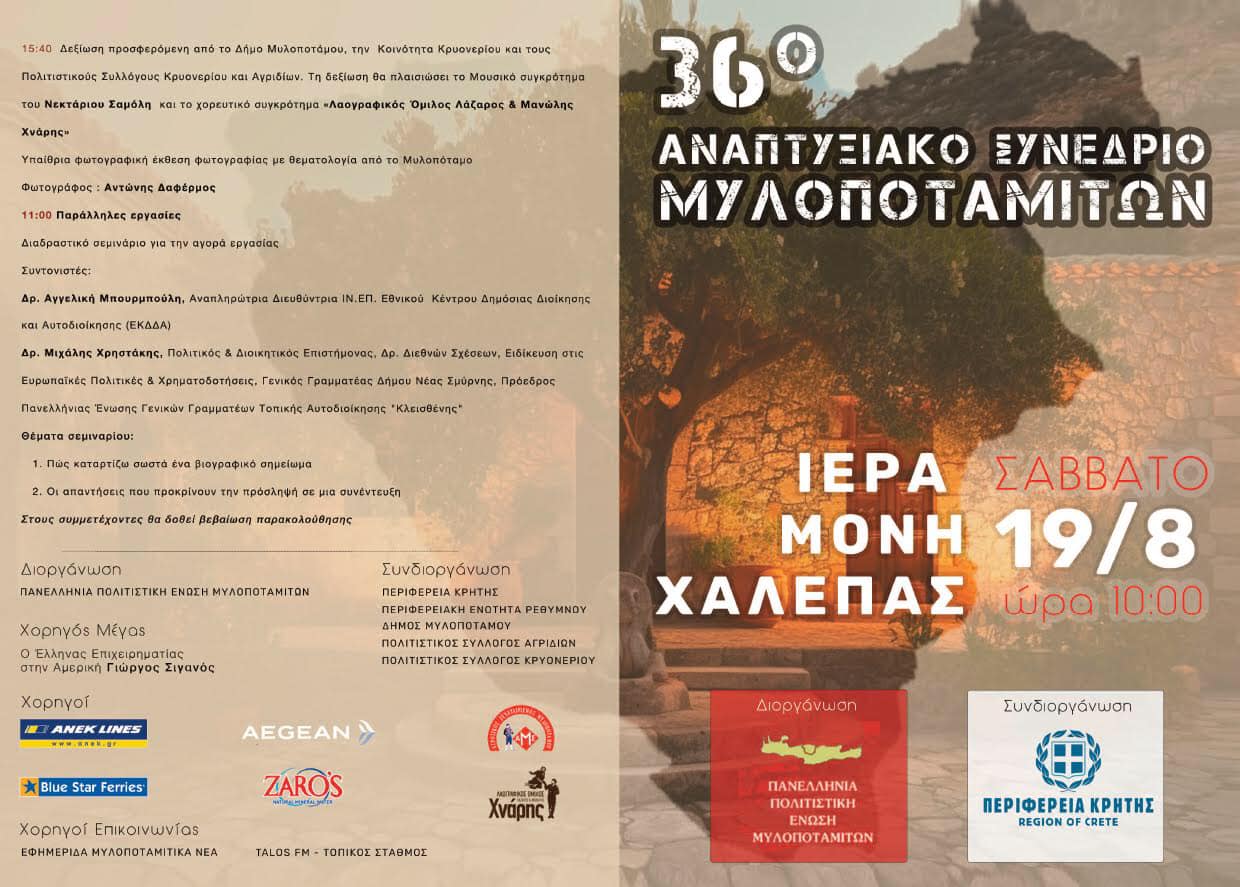 Η «Πανελλήνια Πολιτιστική Ένωση Μυλοποταμιτών», με τη στήριξη της Περιφέρειας Κρήτης, πραγματοποιεί το 36ο Αναπτυξιακό Συνέδριο Μυλοποταμιτών, το Σάββατο 19 Αυγούστου 2023 και ώρα 10:00, στην Ιερά Μονή Μεταμορφώσεως του Σωτήρος Χριστού Χαλέπας, της Κοινότητας Κρυονερίου, του Δήμου Μυλοποτάμου. Στη υλοποίηση του Συνεδρίου συμβάλλουν, ο Δήμος Μυλοποτάμου, η Κοινότητα Κρυονερίου και οι Πολιτιστικοί Σύλλογοι Κρυονερίου και Αγριδίων.
