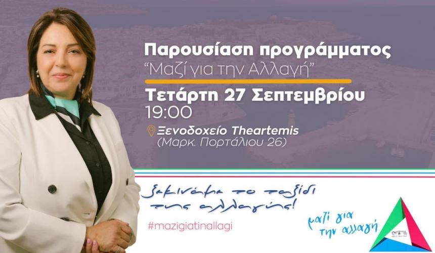 Την Τετάρτη 27 Σεπτεμβρίου και ώρα 19.00 θα πραγματοποιηθεί παρουσίαση του προγράμματος του συνδυασμού, στην αίθουσα συναντήσεων του ξενοδοχείου Theartemis. Ένα πρόγραμμα, το οποίο αποτελείται από προτάσεις ουσίας για το Ρέθυμνο που αγαπάμε και αξίζουμε.