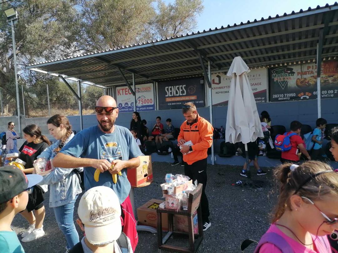 Στο τέλος της όμορφης εκδρομής, οι παράγοντες του νεότευκτου γηπέδου, επιμένοντας στην υγιεινή διατροφή, προσέφεραν σε όλα τα παιδιά μπανάνες και χυμούς φρούτων που τους μοίρασε ο γνωστός ποδοσφαιριστής ΣτέλιοςΔελήμπασης με τη βοήθεια των δασκάλων.