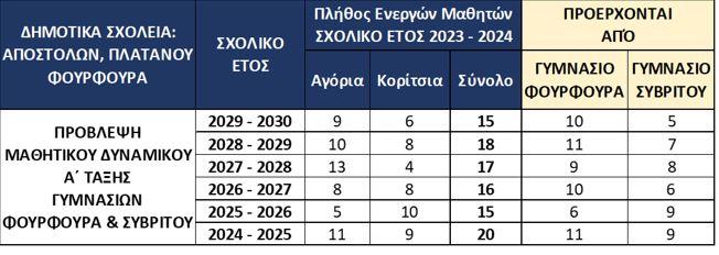 Στον παρακάτω πίνακα παραθέτουμε πρόβλεψη έως το 2030, από στοιχεία του μαθητικού δυναμικού των Δημοτικών Σχολείων, για το μαθητικό δυναμικό της Α΄ Τάξης των Γυμνασίων Φουρφουρά και Συβρίτου από όπου στοιχειοθετείται ο μειούμενος μαθητικός πληθυσμός: