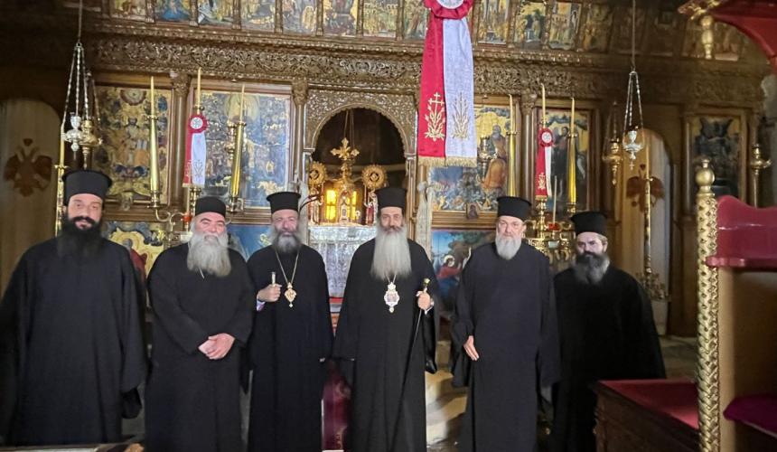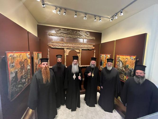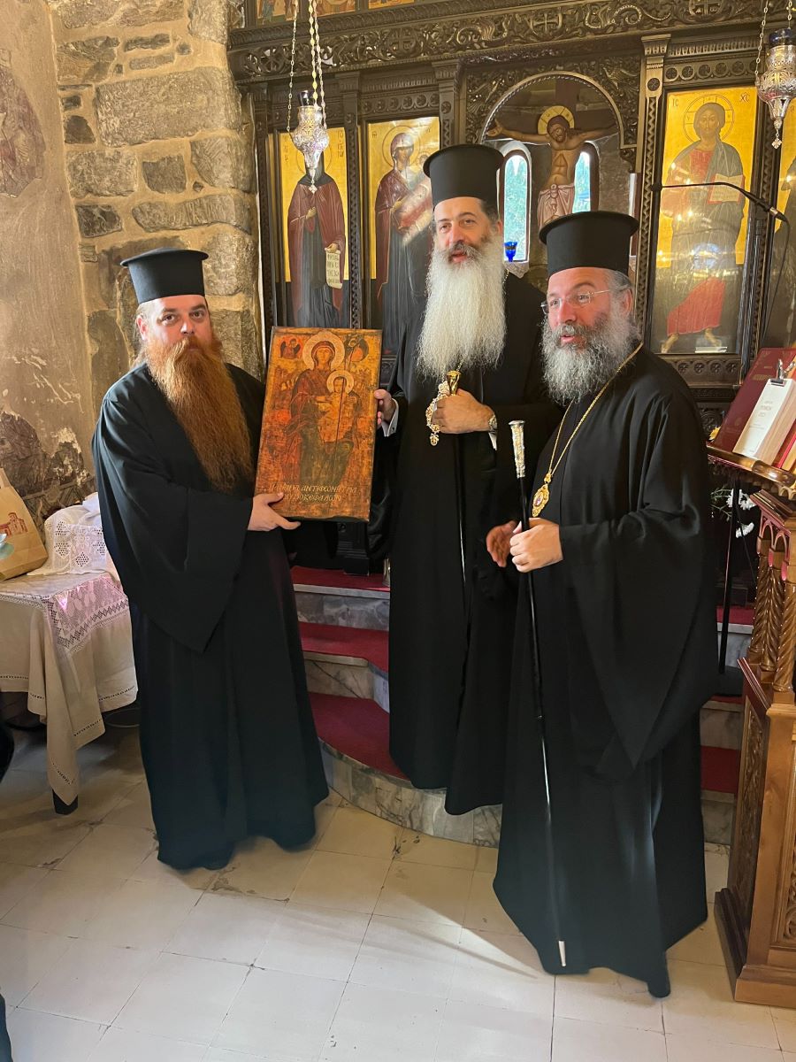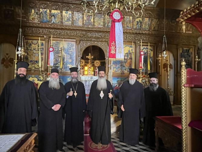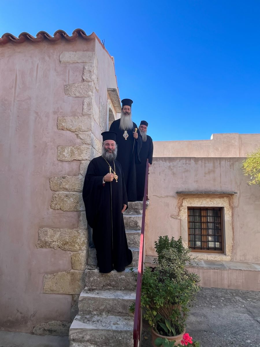Την Τρίτη, 7η Νοεμβρίου 2023, ο Σεβασμιώτατος κ. Συμεών και η συνοδεία του, συνοδευόμενοι από τον Σεβασμιώτατο Ποιμενάρχη μας κ. Πρόδρομο, επισκέφθηκαν προσκυνηματικά το περίπυστο Θεομητορικό Προσκύνημα της Παναγίας των Μυριοκεφάλων, όπου έγιναν δεκτοί από τον Εφημέριο, Αιδεσιμολ. Πρωτοπρεσβύτερο Θεόδωρο Σηφάκη, και ακολούθως την Ιερά Πατριαρχική και Σταυροπηγιακή Μονή Προφήτου Ηλιού Ρουστίκων, όπου τους υποδέχθηκε ο Ηγούμενος, Πανοσιολ. Αρχιμανδρίτης Ιωάννης Κουφουδάκης.