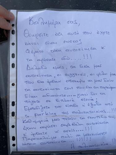 Όπως μπορείτε να δείτε και σε σημείωμα που άφησε σε ένα από τα ενοικιαζόμενα αυτοκίνητα κάτοικος της περιοχής, με ευγενικό τρόπο ζητάει «κατανόηση και σεβασμό» και καλεί τον ιδιοκτήτη τους να μετακινήσει όσα οχήματα εμποδίζουν την είσοδο στο πάρκινγκ της πολυκατοικίας του.
