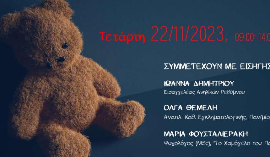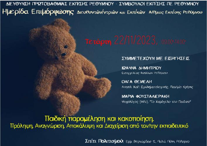 Η Διεύθυνση Πρωτοβάθμιας Εκπαίδευσης και οι Σύμβουλοι Πρωτοβάθμιας Εκπαίδευσης Ρεθύμνου διοργανώνουν ημερίδα με θέμα: Παιδική παραμέληση και κακοποίηση. Αναγνώριση, Πρόληψη, Διαχείριση από τους εκπαιδευτικούς.