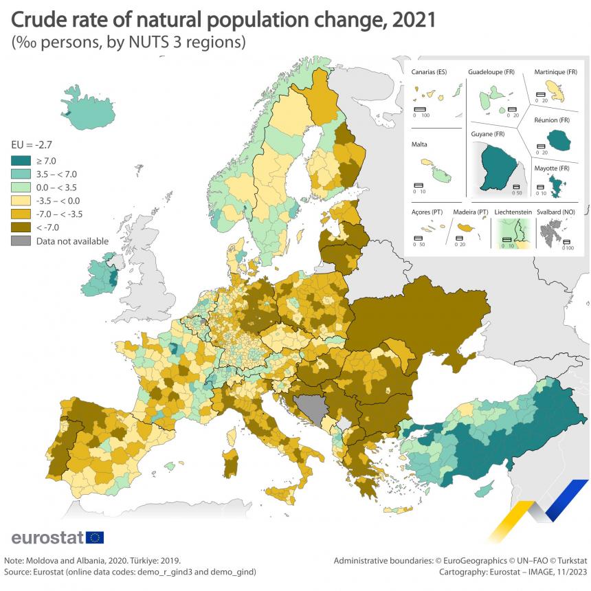 Το 2021, ο ρυθμός φυσικής πληθυσμιακής αλλαγής της ΕΕ ήταν -2,7 ανά 1.000 άτομα. Σε επίπεδο NUTS 3 (σ.σ. διοικητικές περιφέρειες στις χώρες μέλη που αντιστοιχούν στους νομούς της Ελλάδας), 980 περιφέρειες από τις 1.164, για τις οποίες υπάρχουν διαθέσιμα στοιχεία, είχαν αρνητικό ρυθμό φυσικής μεταβολής του πληθυσμού (που αντιπροσωπεύεται από κίτρινες περιοχές στον χάρτη), 173 περιφέρειες κατέγραψαν θετικό ποσοστό και 11 περιφέρειες δεν σημείωσαν καμία αλλαγή (ίσος αριθμός γεννήσεων με τους θανάτους). Αμφότερες αυτές οι περιοχές απεικονίζονται με πράσινο-μπλε χρώμα στον χάρτη.