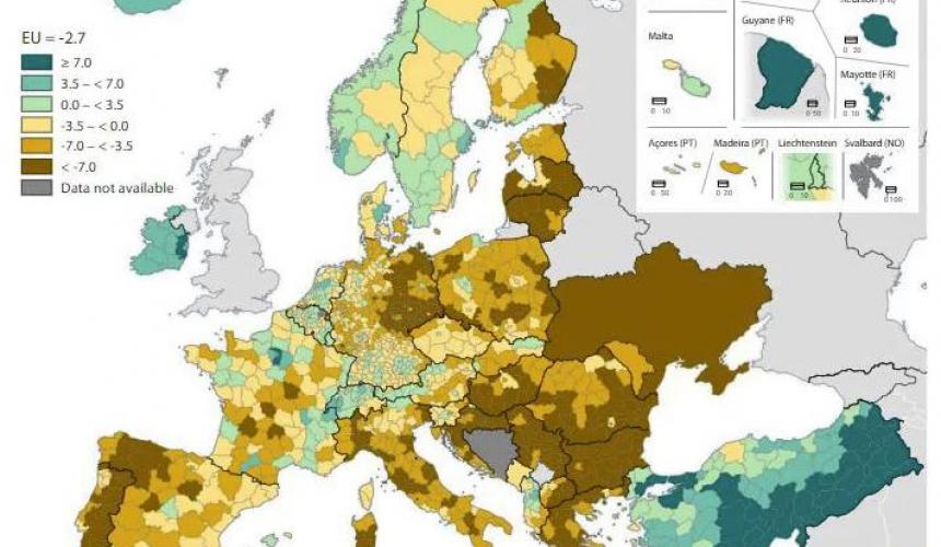 Οι περιοχές της Ευρώπης που επλήγησαν περισσότερο από την απώλεια πληθυσμού ήταν όλες στη Βουλγαρία. Αντίθετα, κάθε περιοχή στην Ιρλανδία είχε θετικό ρυθμό φυσικής μεταβολής του πληθυσμού το 2021, ενώ ένας σχετικά υψηλός αριθμός περιοχών που βρίσκονται στο Βέλγιο, Γαλλία, Ολλανδία, Αυστρία και Σουηδία κατέγραψαν επίσης θετικά ποσοστά, πράγμα που συνέβη επίσης στο Λουξεμβούργο και την Κύπρο.