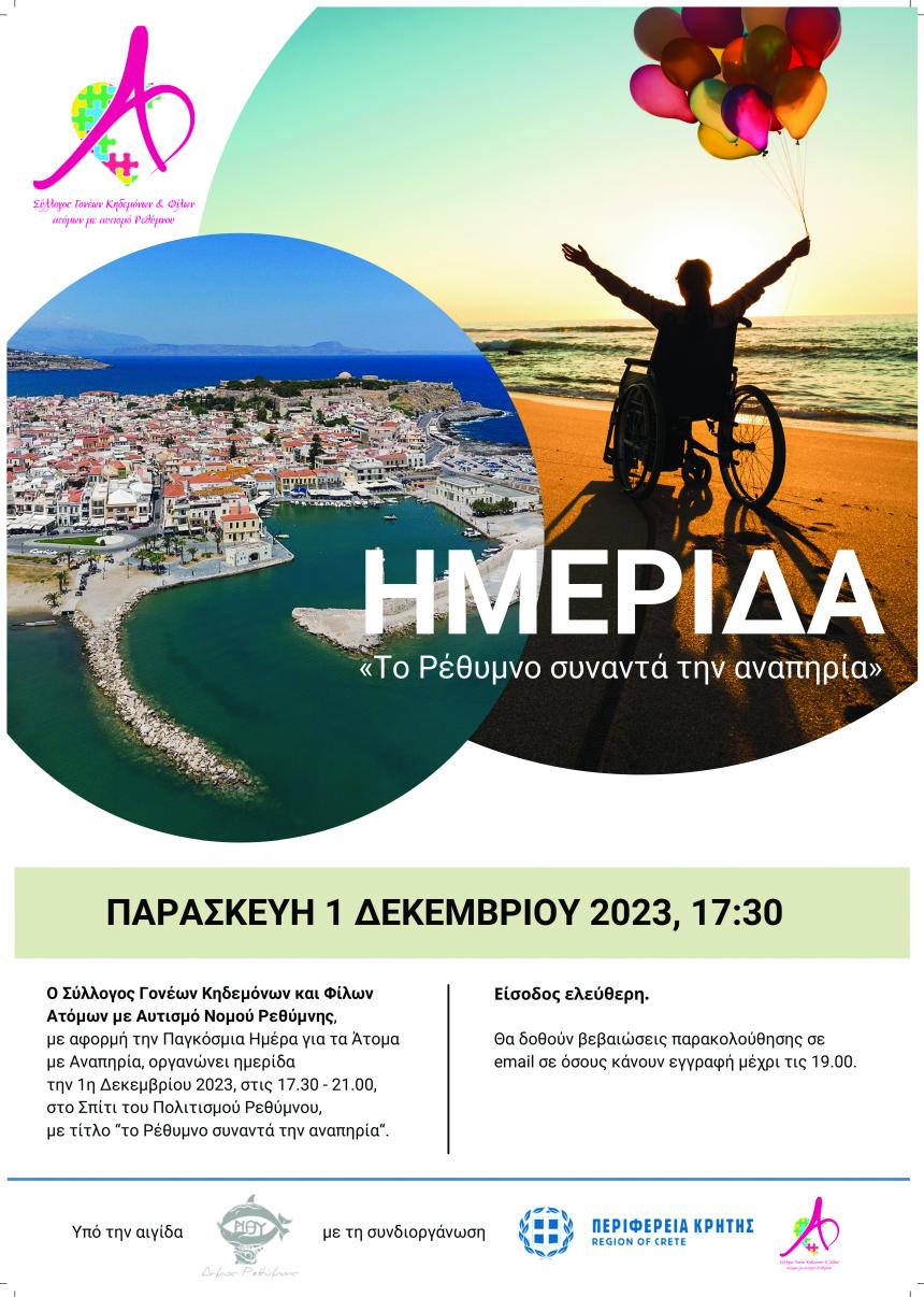 Ο Σύλλογος γονέων και φίλων ατόμων με αυτισμό Ρεθύμνου, με αφορμή την Παγκόσμια μέρα για τα άτομα με αναπηρία, οργανώνει ημερίδα την 1η Δεκεμβρίου 2023, στις 17.30 – 21.00, στο Σπίτι του Πολιτισμού Ρεθύμνου με τίτλο «Το Ρέθυμνο συναντά την αναπηρία».