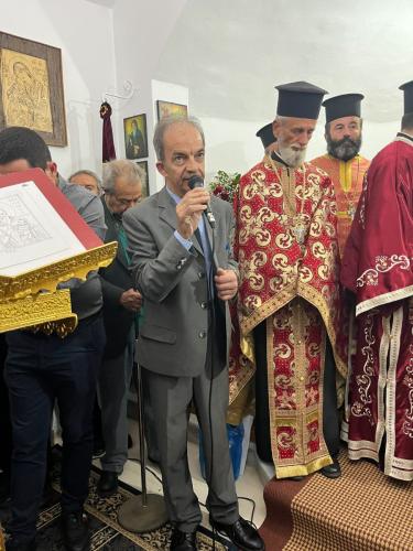 Ο Σεβασμιώτατος, στην προσλαλιά του, ευχαρίστησε όλους για την παρουσία τους και ευχήθηκε όλοι μας να αναπαυόμαστε στην αγκαλιά των Αγίων, όπως ο Άγιος Στυλιανός στην Ιερά του Εικόνα κρατεί το βρέφος, και να αισθανόμαστε την παρουσία των Αγίων στη ζωή μας διαρκώς, ενώ συνεχάρη τον κ. Ιωσήφ Κολυβάκη για την αγάπη του στην Εκκλησία και την πολυτίμητη προσφορά του στον τόπο.