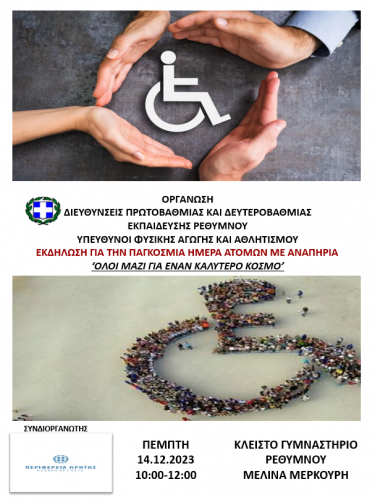 Η Διεύθυνση της Δευτεροβάθμιας Εκπαίδευσης Ρεθύμνου, αντιλαμβανόμενη πλήρως την έννοια της ενταξιακής εκπαίδευσης και της αποδοχής όλων των μαθητών χωρίς καμία εξαίρεση, αγωνίζεται στο πλευρό μαθητών και εκπαιδευτικών για την κάλυψη των κενών Ειδικής Αγωγής ώστε όλοι οι μαθητές, σε ένα πλαίσιο συμπερίληψης, να απολαμβάνουν αδιακρίτως την πρόσβαση στην εκπαίδευση. Όραμά μας η ενίσχυση της ποιότητας ζωής και η ενδυνάμωση των ατόμων με αναπηρία αλλά και των οικογενειών τους, με στόχο την εξασφάλιση της ισότιμης συμμετοχής τους στην εκπαιδευτική διαδικασία και την ομαλή κοινωνική τους ένταξη. Στο πλαίσιο αυτό, σας προσκαλούμε την Πέμπτη 14 Δεκεμβρίου και ώρα 10.00-12.00 στην εκδήλωση με τίτλο «Όλοι μαζί για έναν καλύτερο κόσμο» στο κλειστό γήπεδο Μελίνα Μερκούρη, η οποία θα πραγματοποιηθεί σε συνεργασία με τη Διεύθυνση Πρωτοβάθμιας Εκπαίδευσης Ρεθύμνου με συμμετοχή των Ειδικών Σχολείων αλλά και Γυμνασίων και Δημοτικών Σχολείων του νομού.