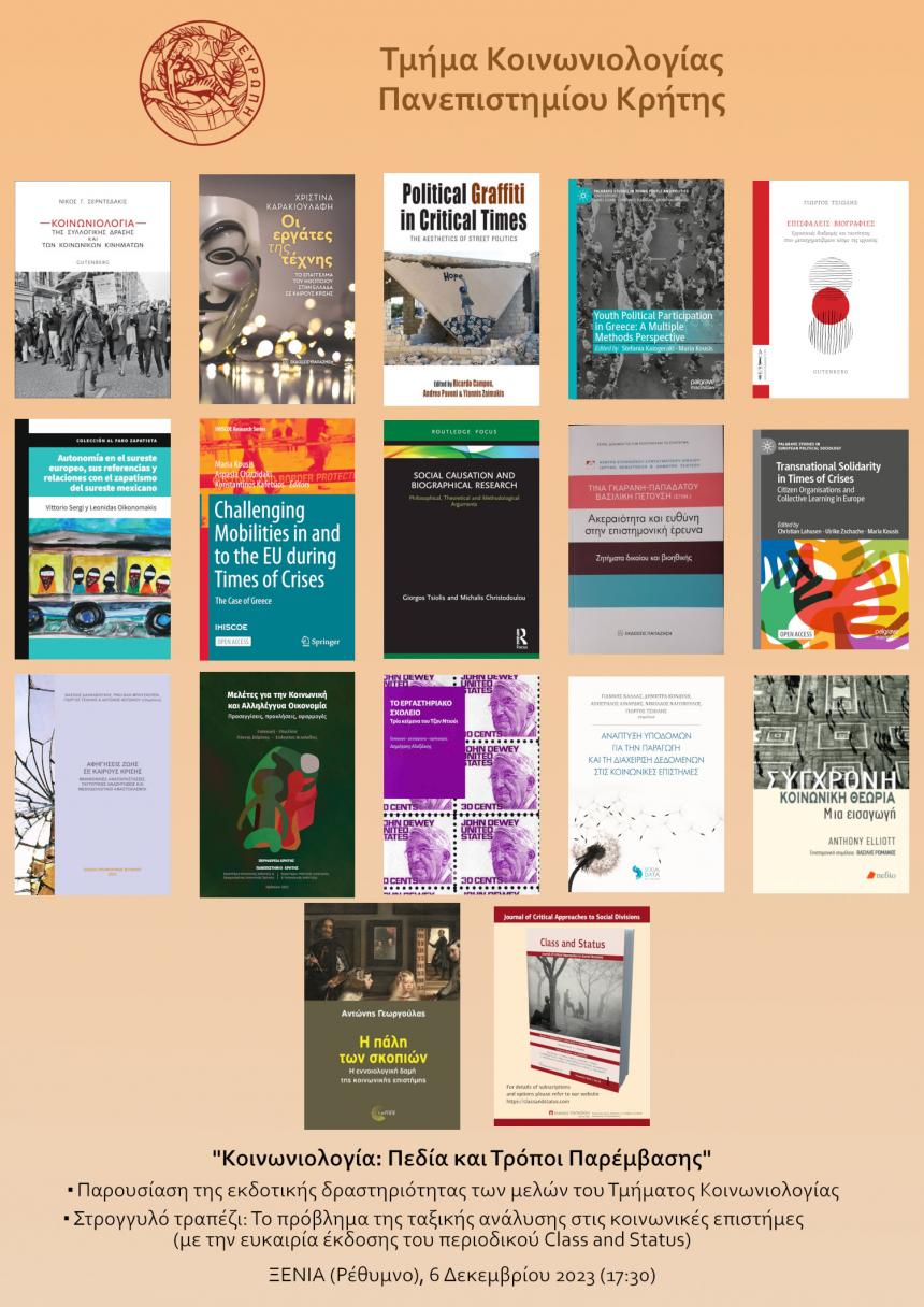 Το Τμήμα Κοινωνιολογίας του Πανεπιστημίου Κρήτης διοργανώνει την Τετάρτη, 6 Δεκεμβρίου 2023 (17.30), στο Φοιτητικό Πολιτιστικό Κέντρο "ΞΕΝΙΑ" (Ρέθυμνο) εκδήλωση με θέμα: «Κοινωνιολογία: πεδία και τρόποι παρέμβασης». Η εκδήλωση θα έχει δύο μέρη: Στο πρώτο μέρος θα παρουσιαστεί η εκδοτική δραστηριότητα των μελών του Τμήματος Κοινωνιολογίας (μονογραφίες, συλλογικοί τόμοι, μεταφράσεις και επιμέλειες) κατά την τελευταία τριετία, που αριθμεί 16 βιβλία. Στο δεύτερο μέρος θα παρουσιαστεί ένα νέο επιστημονικό περιοδικό που ιδρύθηκε με τίτλο «Class and Status”, το οποίο επικεντρώνει σε θέματα κοινωνικών τάξεων και ταξικής ανάλυσης. Θα ακολουθήσει στρογγυλό τραπέζι με θέμα: "Το πρόβλημα της ταξικής ανάλυσης στις κοινωνικές επιστήμες". Ομιλητές θα είναι οι κ.κ. Ιορδάνης Ψημμένος, Χριστόφορος Σκαμνάκης Δημήτρης Μυλωνάκης και Αντώνης Γεωργούλας. Το στρογγυλό τραπέζι θα συντονίσει η Τίνα Κακλαμάνη.