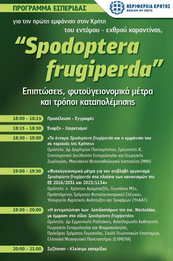 Η Περιφέρεια Κρήτης διοργανώνει αύριο 20 Δεκεμβρίου στην αίθουσα του Επιμελητηρίου Ρεθύμνης, ώρα 18:00, ενημερωτική εκδήλωση με θέμα : «Πρώτη εμφάνιση του, για την πρώτη εμφάνιση του εντόμου – εχθρού καραντίνας «Spodoptera fruigipedra» στην Κρήτη, για την αποφυγή δυσμενών επιπτώσεων.