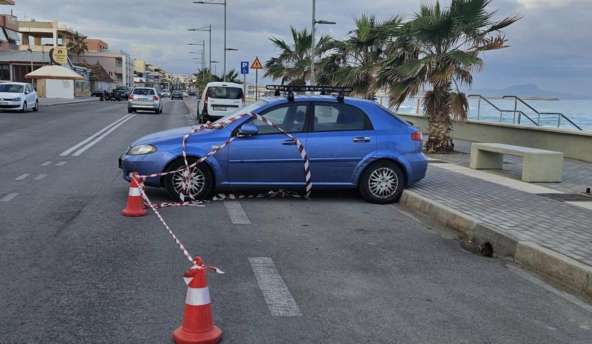Κάτι δεν πήγε καλά με το παρκάρισμα του συγκεκριμένου αυτοκινήτου, στο ανατολικό παραλιακό μέτωπο του Ρεθύμνου, αφού βρέθηκε σταθμευμένο κάθετα στο πεζοδρόμιο, ενώ φαίνεται καθαρά και από διπλανό όχημα, ότι η στάθμευση στο σημείο γίνεται παράλληλα με το πεζοδρόμιο.
